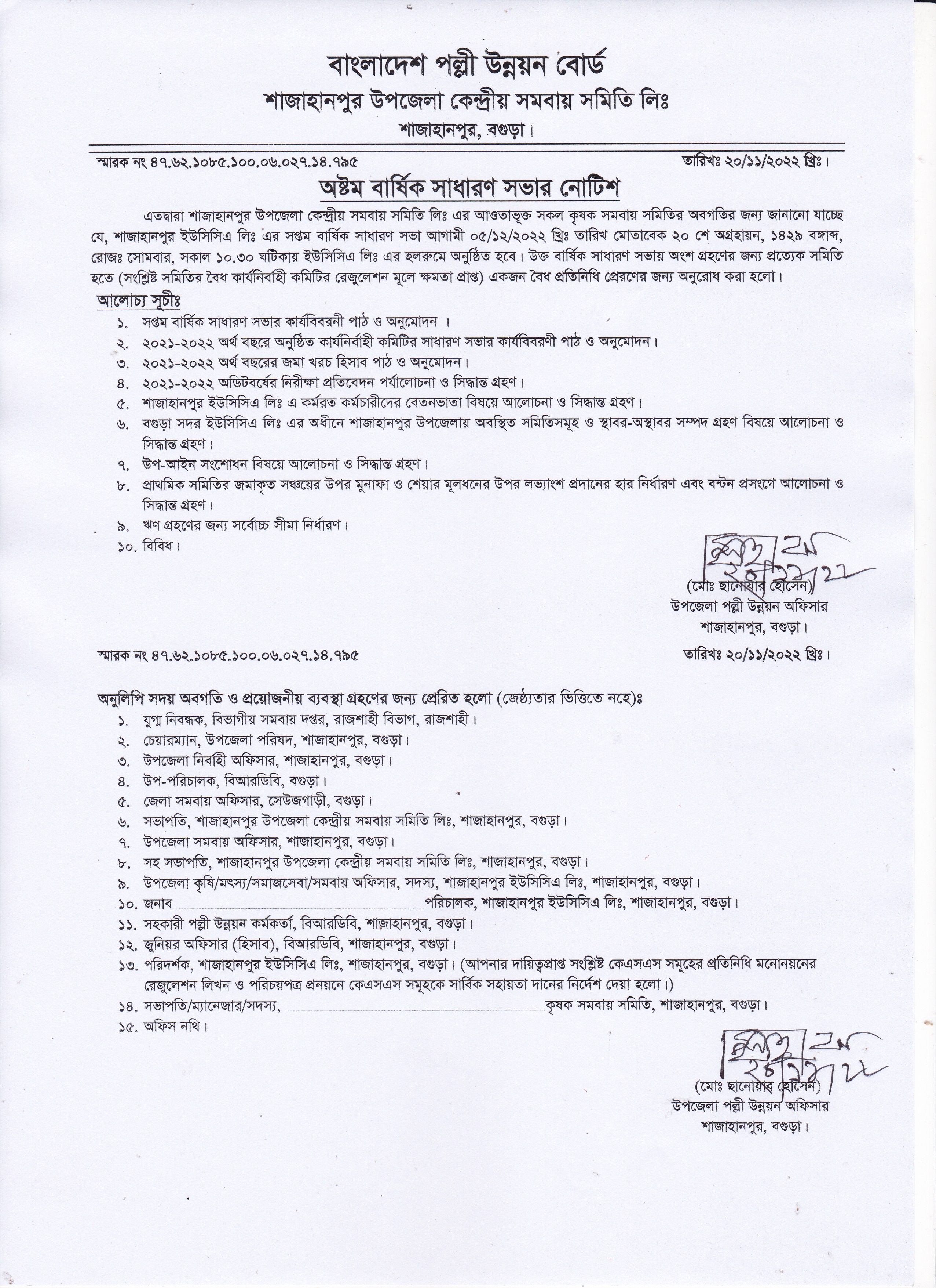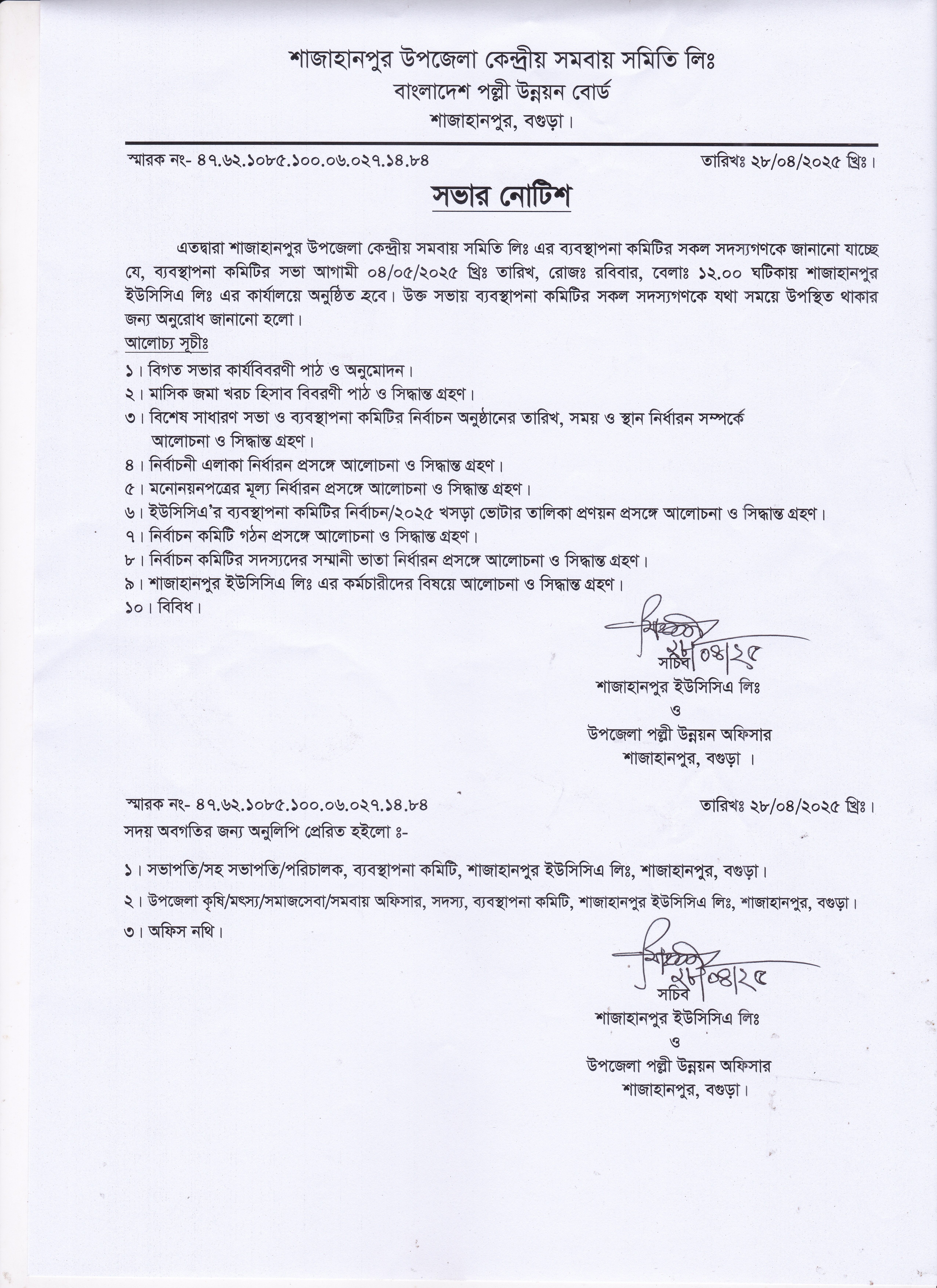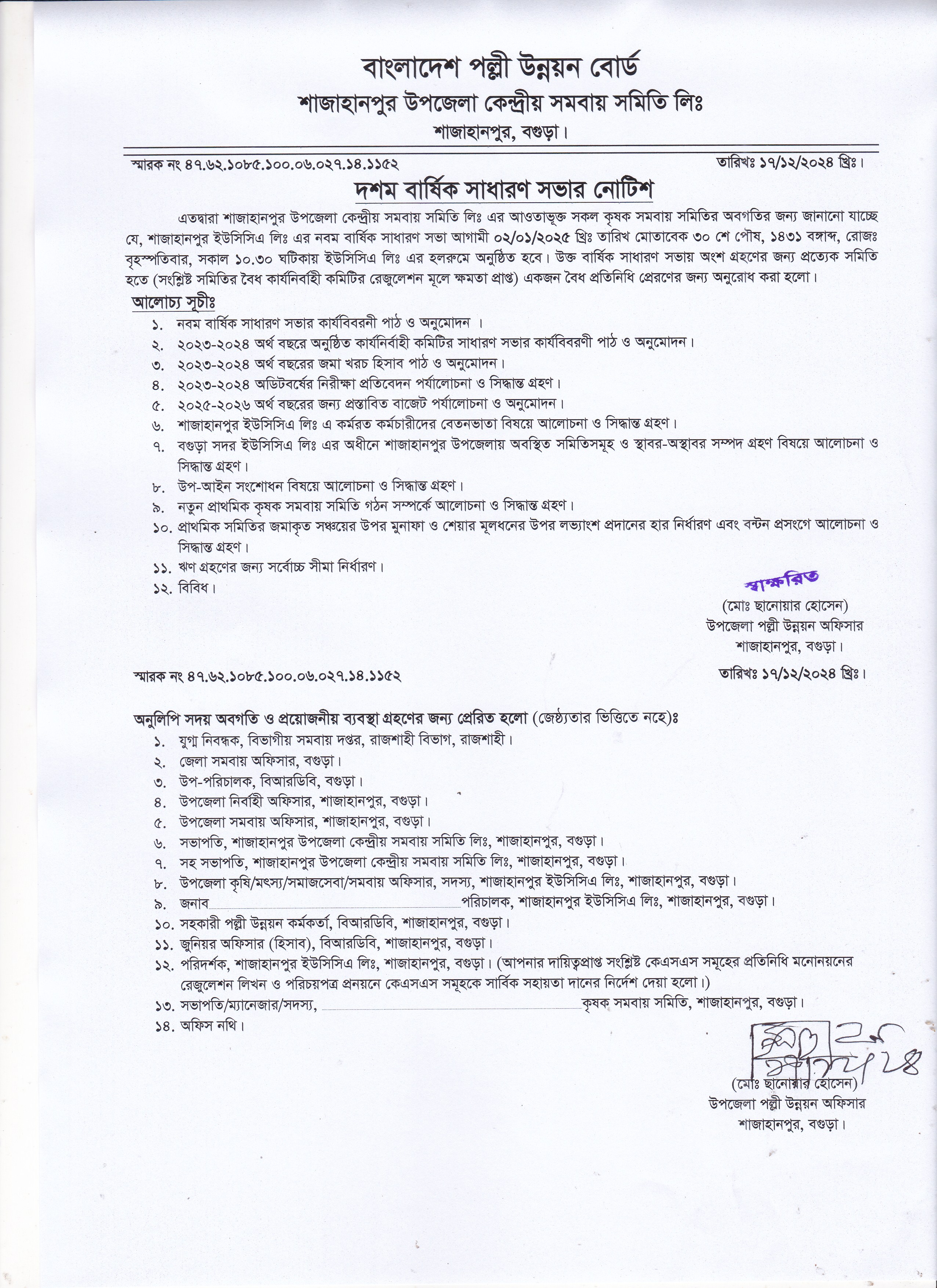 | ৮ | শাজাহানপুর ইউসিসিএ লিঃ এর দশম বার্ষিক সাধারণ সভার নোটিশ | | | ১৭-১২-২০২৪ | দেখুন |