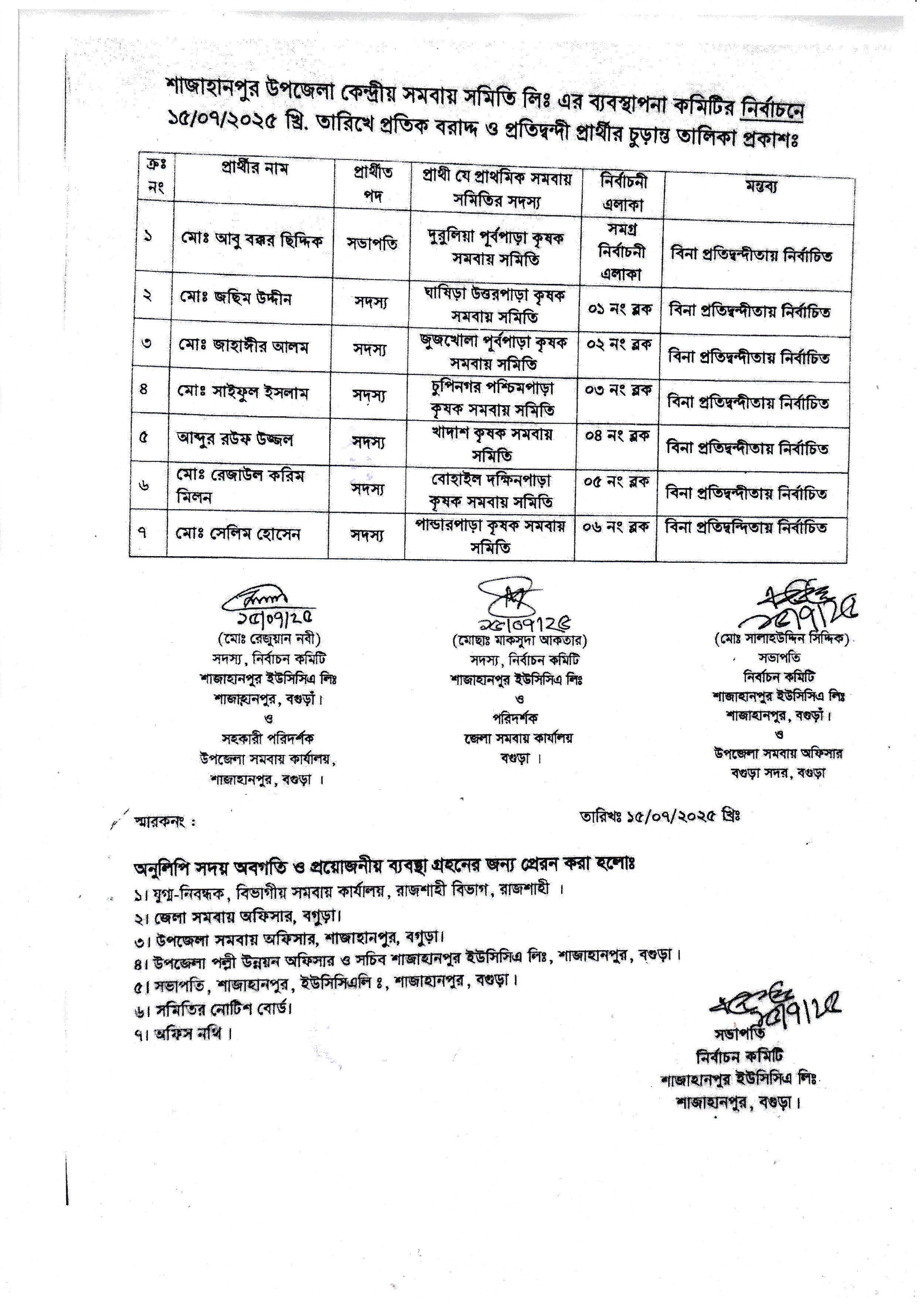 | ৬ | শাজাহানপুর ইউসিসিএ লিঃ এর ব্যবস্থাপনা কমিটির নির্বাচন-২০২৫ উপলক্ষ্যে খসড়া ভোটার তালিকা | | | ০৪-০৫-২০২৫ | দেখুন |